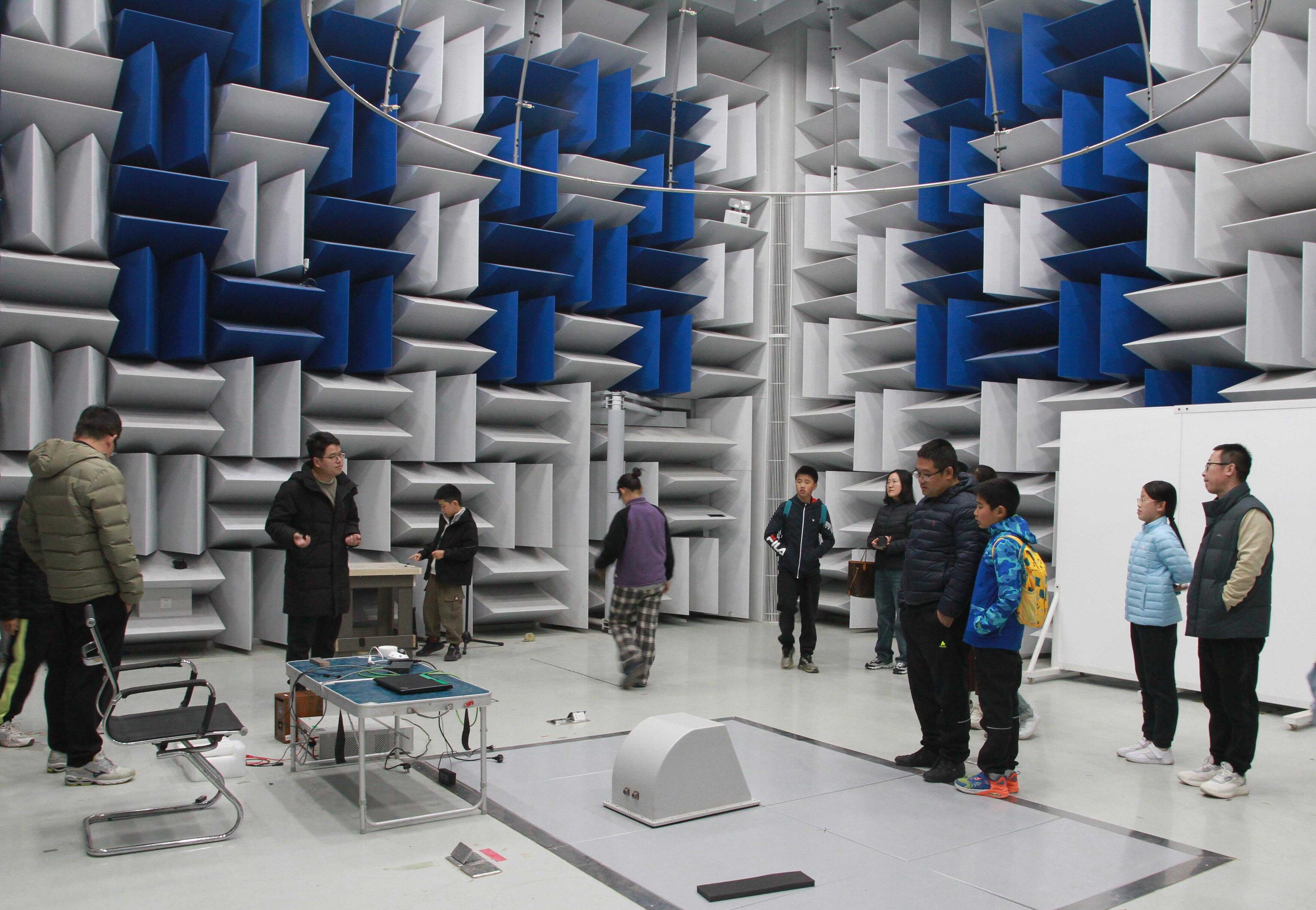 实验室参观环节,同学们在水声学实验室了解了如何利用消声水池模拟海洋环境开展水声试验,学习了换能器的工作原理;在空气声学实验室,通过参观全消声室、半消声室以及混响室,学习了声音在空气中的传播特性,感受声学的独特魅力。
