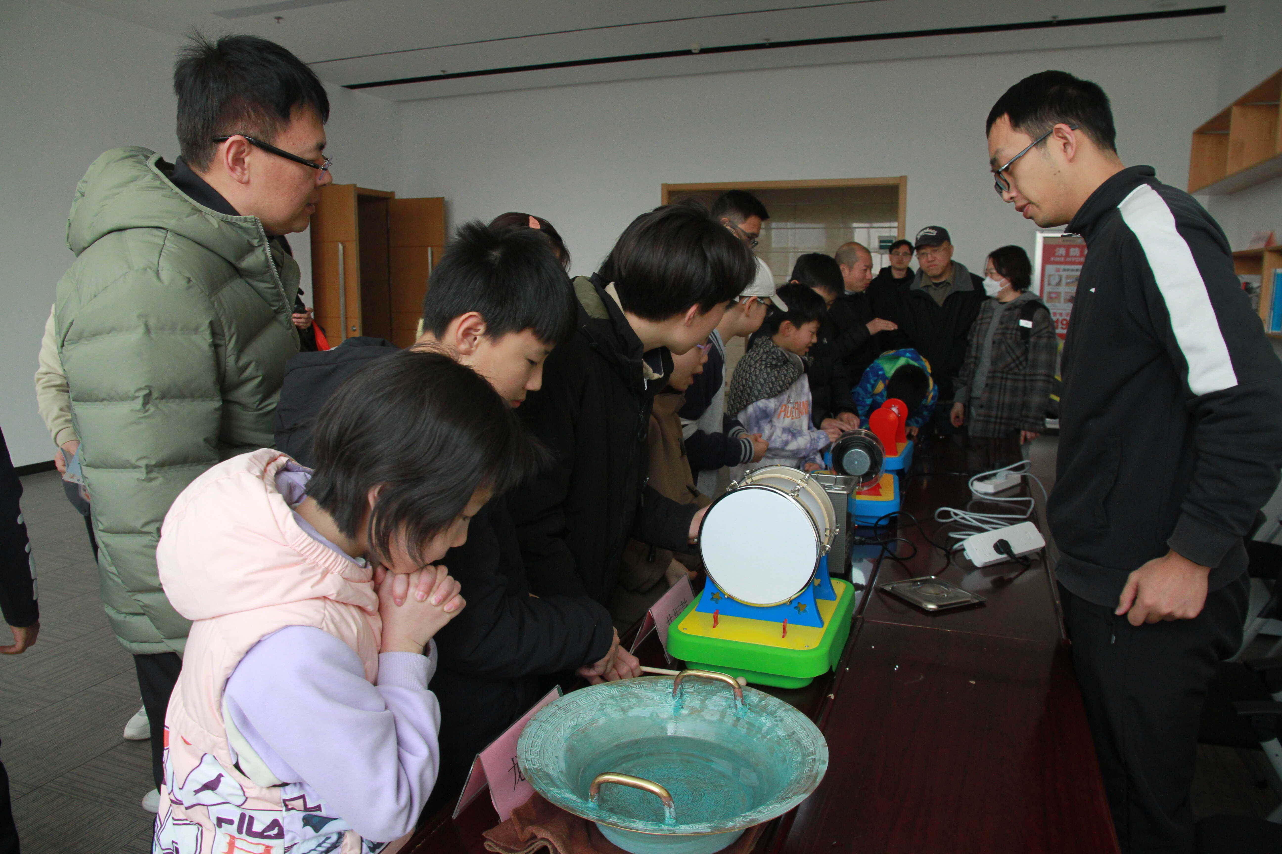 声学小实验互动环节,声悬浮、共振鼓、龙洗盆、雪浪声波、声能灭火、超声清洗、声纹玫瑰等趣味声学小实验,让同学们置身于奇妙的声学世界流连忘返。