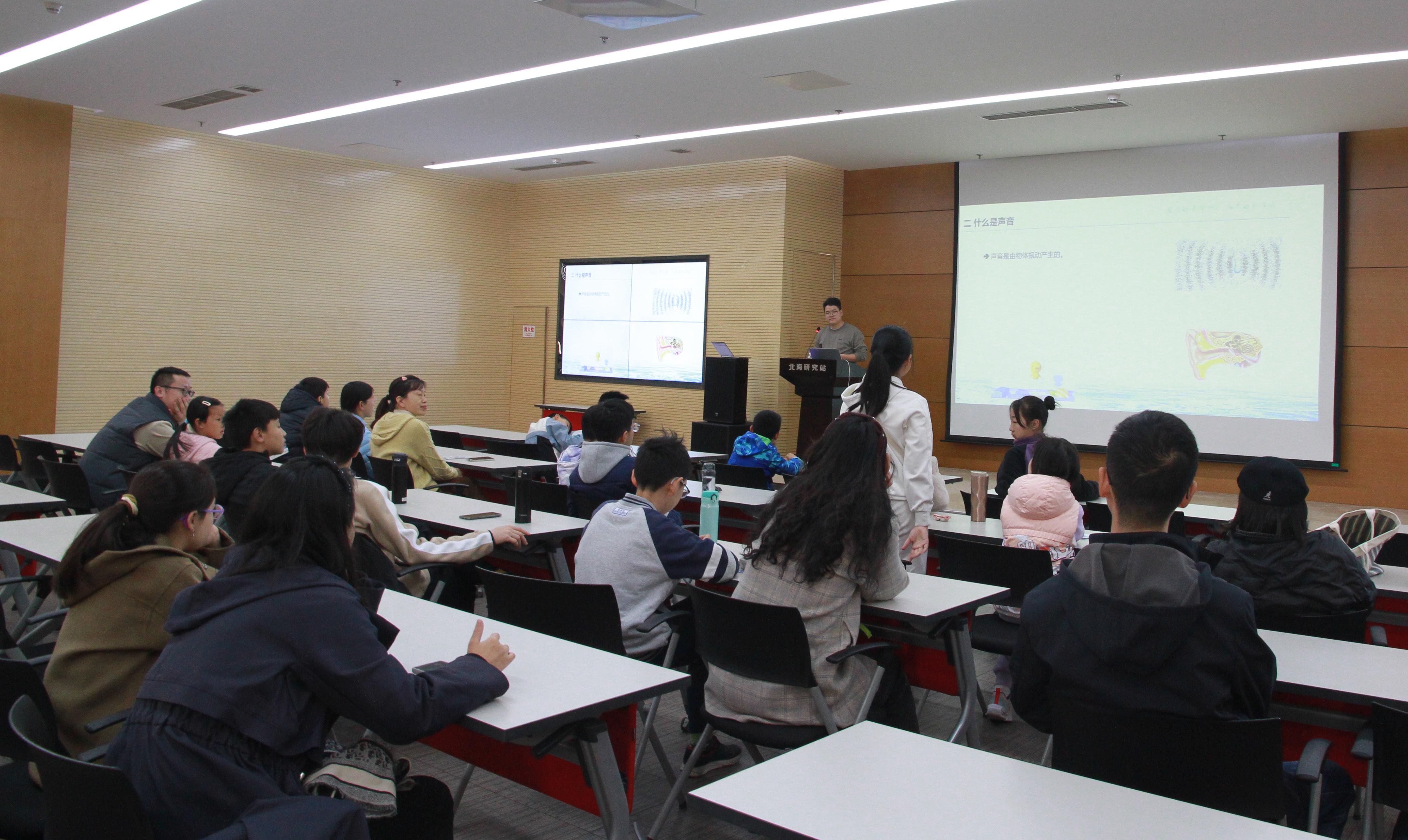 科普报告环节,工程师刘忠远作《走进声音的世界》科普报告,报告从声音的基本特性,声波的产生、传播、感知以及声学的应用等几方面徐徐展开,并通过现场播放不同频率的声音,来测试不同人群的听力敏感性,同时呼吁大家在日常生活中养成健康用耳的习惯,科学保护听力。