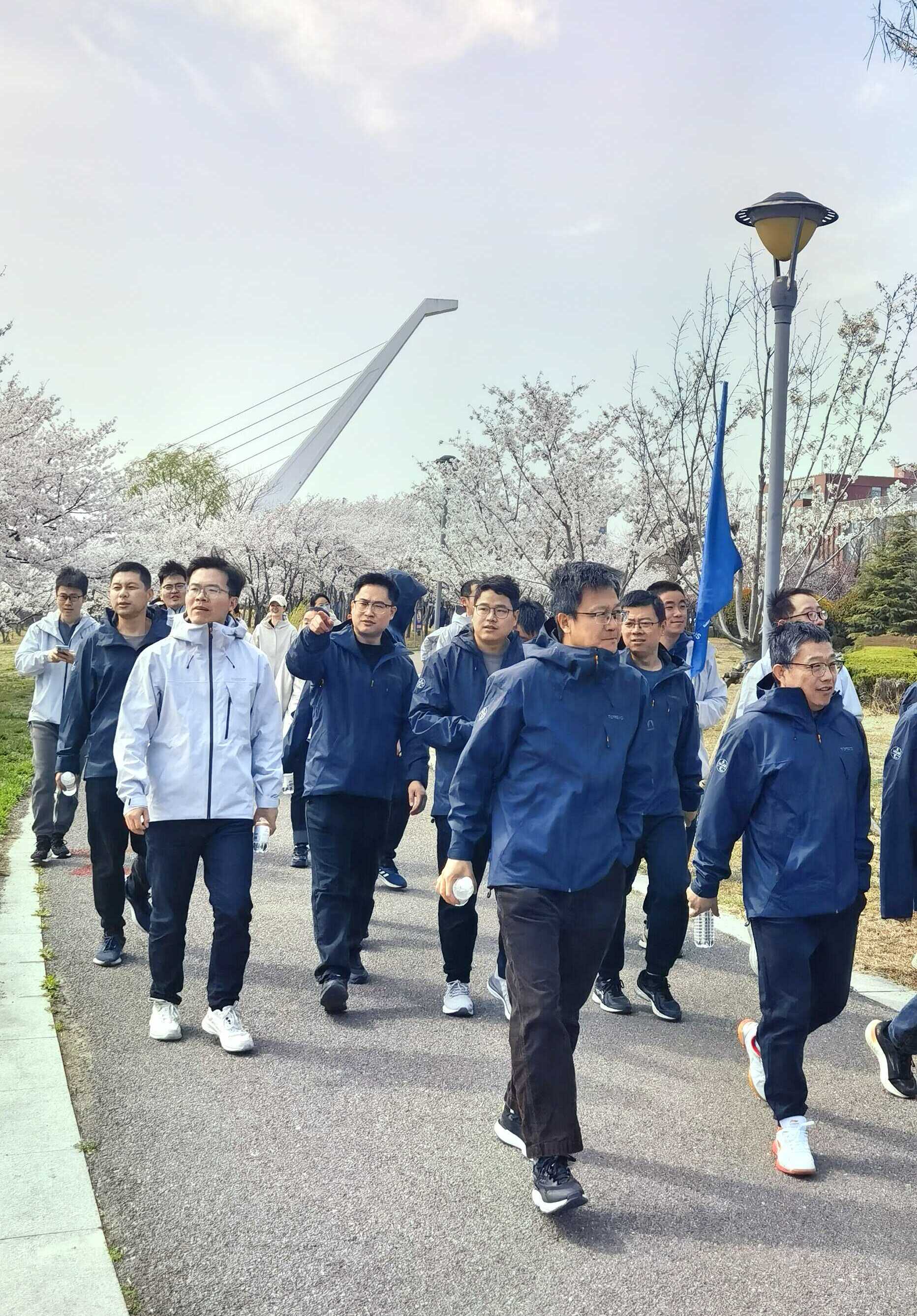 下午2时,健步行活动参与职工在楼下集合,合影留念后,活动正式启动,职工们精神抖擞地踏上征程。健步路线精心规划,沿途经过高新区中央智力岛环湖步道、澜湾艺术公园等特色区域,如云似雪的樱花已进入盛花期,层层叠叠的花瓣在阳光下泛着珍珠般的光泽,蜜蜂在花间忙碌,鸟雀在枝头啼鸣,处处都是春天的絮语。澜湾艺术公园的小广场上空,几只风筝正乘着春风扶摇直上。大家漫步在湖边小径上,边走边感慨,平时忙忙碌碌没有放慢脚步欣赏春日美景,今天才发现园区周边环境也这么优美。